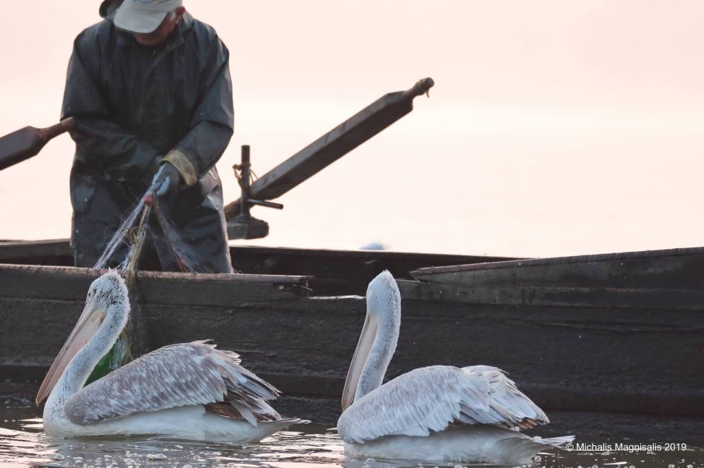 Οι μόνοι άνθρωποι που εμπιστεύονται οι αργυροπελεκάνοι, είναι οι ψαράδες. Θα μπορούσαμε να πούμε ότι υπάρχει μια σχέση συμβίωσης μεταξύ τους. Έχοντας φτάσει σε πιο βαθειά νερά και ενώ ο ήλιος έχει αρχίσει να βάζει τις πρώτες του χρωματιστές πινελιές, συναντάμε τον Θωμά που μαζεύει τα δίχτυα του. Τα πουλιά γυροφέρνουν την πλάβα και περιμένουν ανυπόμονα. Ο Θωμάς ανεβάζει την ψαριά και πότε πότε τους πετάει κανένα ψάρι, το οποίο σε χρόνο μηδέν καταλήγει ολόκληρο, στον μεγάλο σάκκο κάποιου ράμφους. «Αυτά είναι μικρά», μας λέει.»Γεννήθηκαν την άνοιξη. Χρόνια τώρα, ζω εδώ με τα πουλιά».