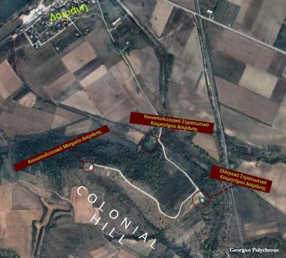 Πάνω από το χωριό ξεχωρίζει ένας λόφος, τον οποίο οι Βρετανοί είχαν ονομάσει Colonial Hill, και αποτελεί τον σημαντικότερο τόπο μνήμης στην ευρύτερη περιοχή. Ξεκινώντας την ανάβασή του, στους πρόποδες του λόφου συναντάμε το Κοινοπολιτειακό Στρατιωτικό Κοιμητήριο Δοϊράνης. Σε αυτό έχουν ταφεί συνολικά 1.338 πεσόντες των δυνάμεων της Κοινοπολιτείας, 449 εκ των οποίων δεν έχουν αναγνωριστεί, ενώ υπάρχουν επίσης οι τάφοι ενός Γάλλου και 45 Ελλήνων πεσόντων.