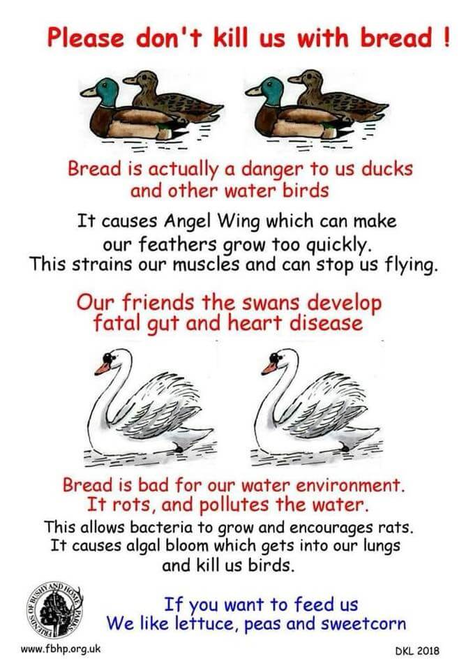 Εκτός από τις δυσάρεστες συνέπειες στην υγεία των πουλιών οι μεγάλες ποσότητες ψωμιού που δεν καταναλώνονται μολύνουν τα νερά, προκαλώντας την ανάπτυξη επικίνδυνων φυκιών και μυκήτων και προσελκύοντας βλαβερά ζωύφια και αρουραίους με αποτέλεσμα την διαταραχή της ισορροπίας του οικοσυστήματος. Αν κάποιος θέλει να ταΐσει τα πουλιά χωρίς να τους κάνει κακό, μπορεί να τους δώσει μαρούλι, αρακά ή καλαμπόκι.