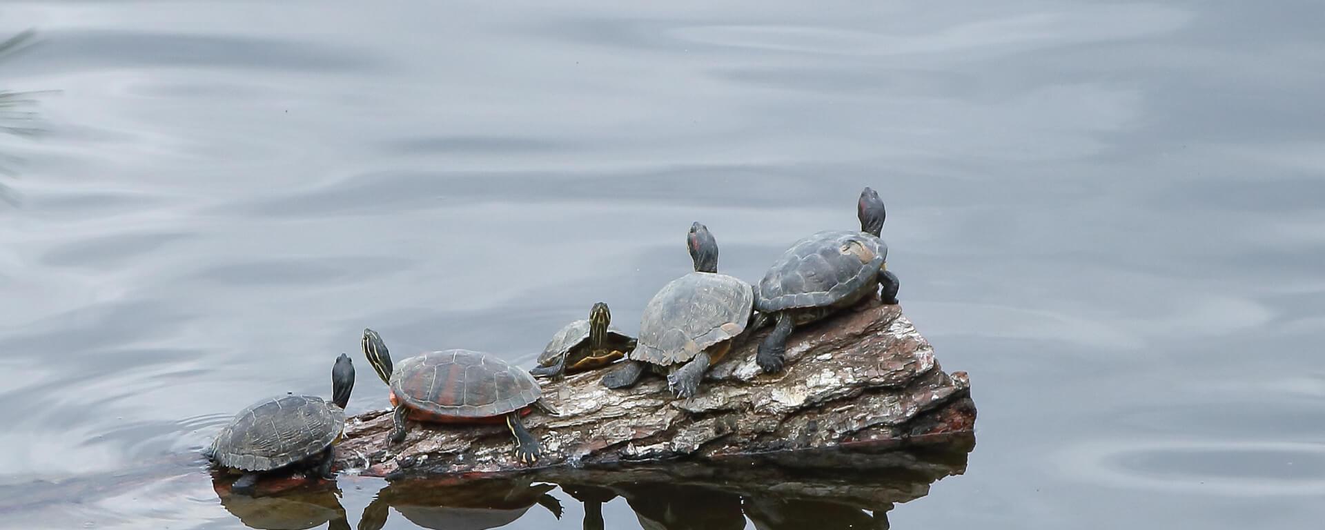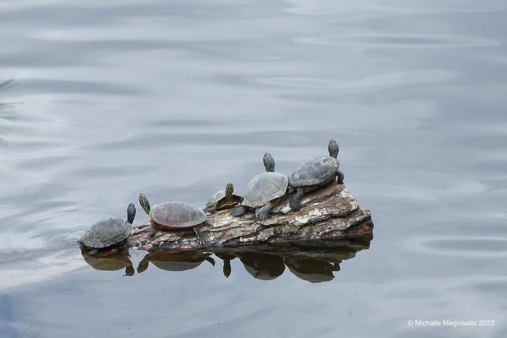 Με τον ερχομό της άνοιξης η θερμοκρασία σιγά σιγά ανεβαινει και οι κάτοικοι της λίμνης αρχίζουν να εγκαταλείπουν τη χειμωνιάτικη κρυψώνα τους. Οι χελώνες του νερού ανήκουν και αυτές στην κατηγορία των ερπετών όπως και οι χελώνες της στεριάς. Όπως όλα τα ερπετά, είναι ψυχρόαιμα ζώα και χρειάζονται τη ζέστη για να επιβιώσουν. Συνάντησα αυτή τη μικρή παρέα να λιάζεται επάνω σε έναν επιπλέοντα κορμό. Ακίνητες και με το κεφάλι τεντωμένο προς τα επάνω, θα έπαιρνα όρκο ότι είναι ψεύτικες. Μετά υπέθεσα ότι είναι αγουροξυπνημένες αφού μόλις έχουν βγει από το χειμερινό τους λήθαργο, ή ότι κάτι έχουν παρατηρήσει εκεί ψηλά και το κοιτούν με απορία.