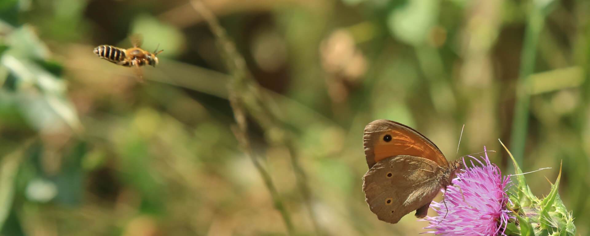 Εν τω μεταξύ στον μικρόκοσμο των εντόμων μια Maniola Jurdina έχει μόλις εγκατασταθεί στο άνθος του γαϊδουράγκαθου. Τρέφεται με φυτικούς ιστούς και νέκταρ και με τον τελετουργικό χορό της θα μεταφέρει τη γύρη, πιστή στο έργο της αναπαραγωγής του κύκλου της ζωής. Την ίδια στιγμή μια μέλλισσα πετάει προς τα εκεί με μεγάλη ταχύτητα έτοιμη να διεκδικήσει το μερίδιό της. Το σώμα της θυμίζει κάτι από μικρό μονοθέσιο αεροπλάνο που έχει ήδη ξεκινήσει την κάθοδο. Λυπάμαι που μέσα από αυτή την εικόνα δεν μπορώ να μεταδώσω τον ήχο από τα διάφανα φτερά της, που παλινδρομούν με συχνότητα…230 παλμούς το λεπτό!