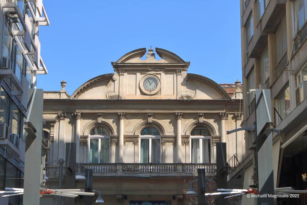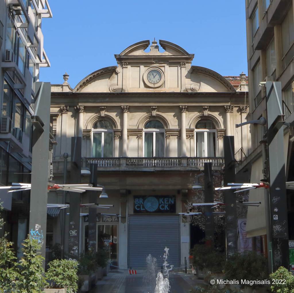 Κατασκευάστηκε το 1906 από τον αρχιτέκτονα Βιταλιάνο Ποζέλι στον κήπο του αρχοντικού της οικογένειας Αλατίνη, με σκοπό να στεγάσει την Τράπεζα της Θεσσαλονίκης (Banque de Salonique). Στον επάνω όροφο υπάρχουν ακόμα σε λειτουργία ορισμένα γραφεία. Εκείνη την εποχή το γραφείο του διευθυντή ήταν ακριβώς κάτω από το ρολόι και έβλεπε από το παράθυρο την θάλασσα, αφού δεν είχαν χτιστεί ακόμα τα κτίρια της σημερινής Πλατείας Χρηματιστηρίου. Στο υπόγειο της στοάς βρισκόταν το θησαυροφυλάκιο, με την βαριά σιδερένια πόρτα να διατηρείται ακόμη και σήμερα.