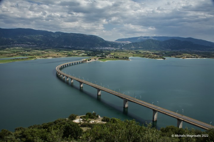 Πέρα από την αισθητική, η καμπυλότητα συμβάλλει στη σταθερότητα της κατασκευής επειδή έτσι απορροφώνται καλύτερα οι ταλαντώσεις. Οι κολώνες στις οποίες στηρίζεται είναι κενές και το εσωτερικό τους περιέχει νερό κάτι που προσθέτει περισσότερη σταθερότητα και κάνει την γέφυρα πιο ασφαλή. Είναι μία από τις μακρύτερες γέφυρες στην Ελλάδα με μήκος 1.372 μέτρα, πλάτος 13,5 μέτρα και ύψος 55 μέτρα από το νερό. Αποτελεί τμήμα της Εθνικής Οδού Κοζάνης-Λάρισας. Η λίμνη σχηματίστηκε το 1973, μετά τη δημιουργία του φράγματος στον ποταμό Αλιάκμονα. Η γέφυρα άρχισε να θεμελιώνεται το 1972 και εγκαινιάστηκε στις 6 Νοεμβρίου 1976.