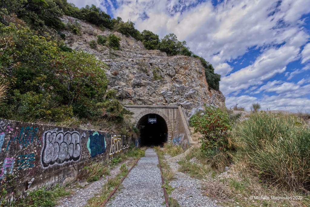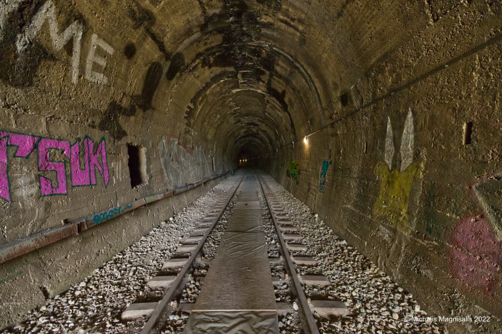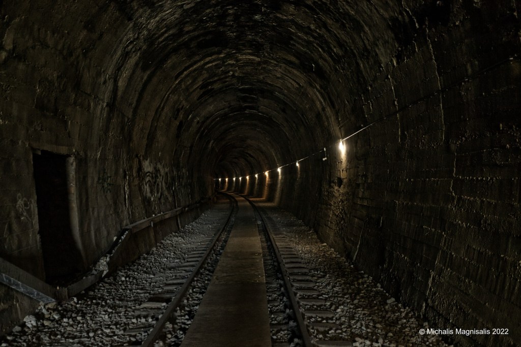 Περπατάμε μέσα στη γαλαρία και πατάμε επάνω στους μεταλλικούς στρωτήρες. Επάνω τους φαίνεται ακόμα το λογότυπο της κατασκευάστριας εταιρίας και η χρονολογία. Το μήκος της είναι μικρό, μόλις 51 μέτρα. Η ελαφριά καμπή όμως που υπάρχει στο μέσο της μας δημιουργεί την αίσθηση ότι είμαστε σε μια άλλη διάσταση, αφού ούτε μπρος ούτε πίσω βλέπεις το πολυπόθητο φως…στο βάθος. Ο χώρος έχει μια ιδιαίτερη αύρα που μας ταξιδεύει στο παρελθόν. Οι μαυρισμένοι τοίχοι από τις ατμάμαξες και τις ντηζελάμαξες της εποχής, οι σιδερένιες ράγες πάνω στις οποιες προσπαθούμε να ισορροπήσουμε, τα χοντρά χαλίκια. Σχεδόν έχουμε αρχίσει να ακούμε τον ήχο του τραίνου που ετοιμάζεται να διασχίσει την γαλαρία.