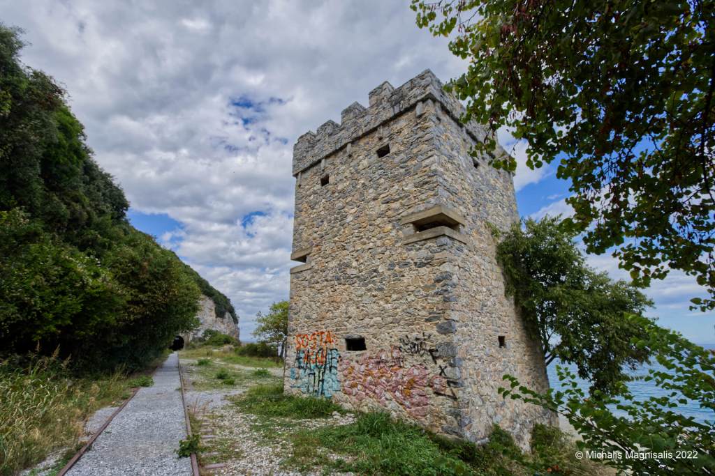 Εκείνη την εποχή το τραίνο ήταν ο μόνος τρόπος σύνδεσης της Κεντρικής Ελλάδας με την Μακεδονία και την Ευρώπη αφού το σημερινό οδικό δίκτυο ήταν τότε ανύπαρκτο. Κατασκευάστηκαν και δύο πύργοι ο ένας δίπλα στην γαλαρία και ο άλλος λίγο πριν τη νότια είσοδό της, για λόγους αμυντικούς. Ο σιδηρόδρομος ταξίδευε στο μεγαλύτερο μέρος της διαδρομής του σε δύσβατες ορεινές διαδρομές, για να αποφύγει εχθρικά πυρά που πιθανόν να προέρχονταν από την θάλασσα. Στο παραθαλάσιο κομμάτι όμως έπρεπε να υπάρχει επιτήρηση ώστε να προστατεύονται οι ταξιδιώτες και τα εμπορεύματα.