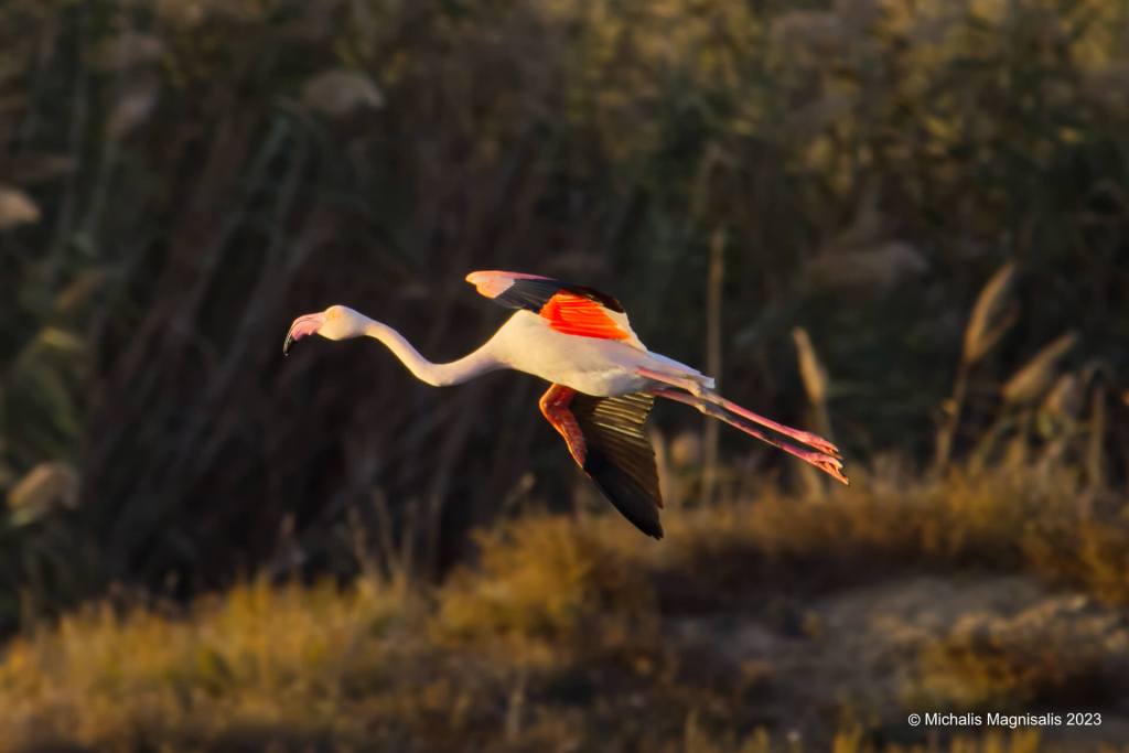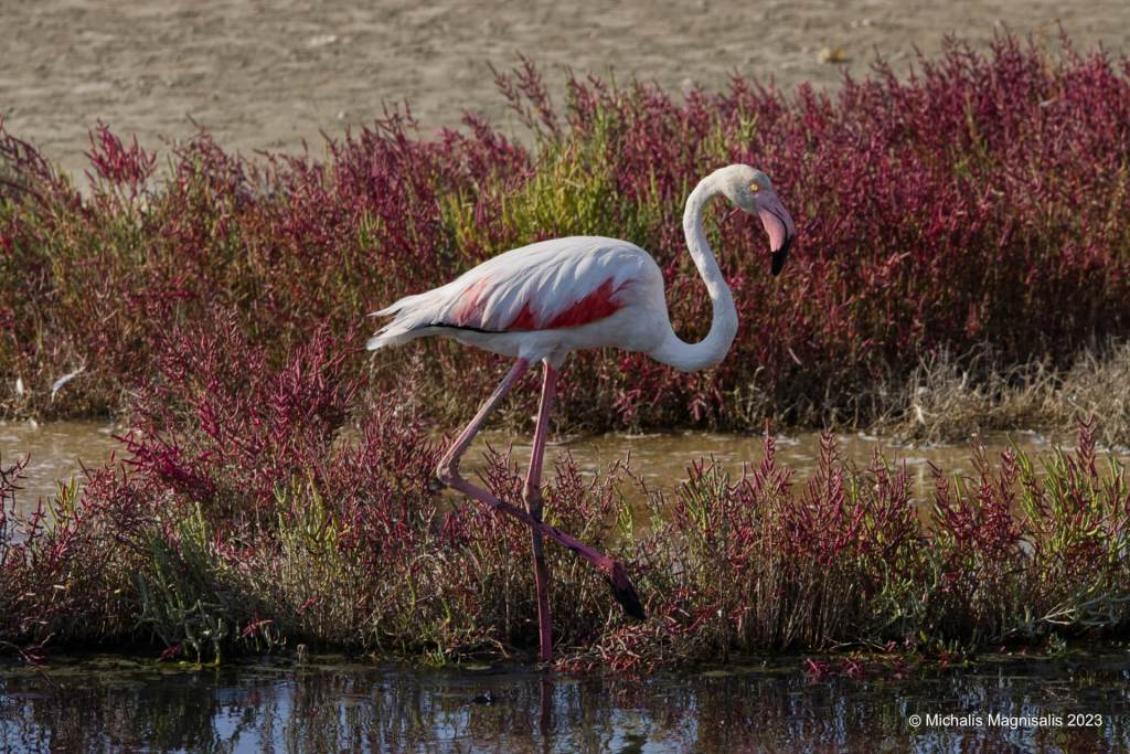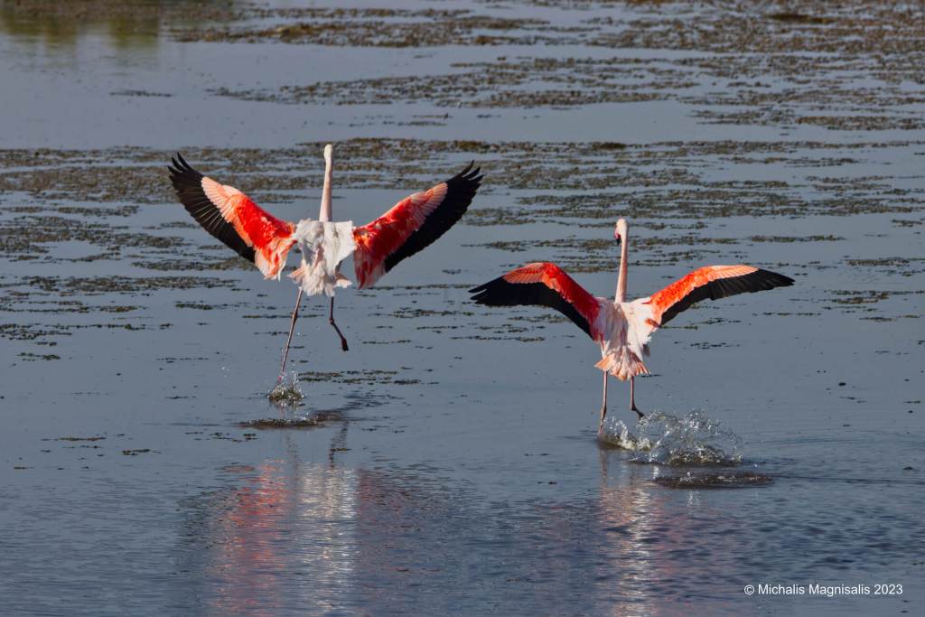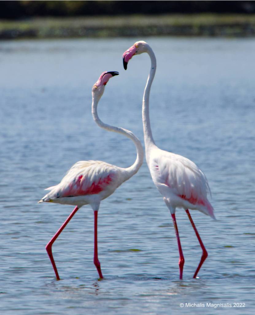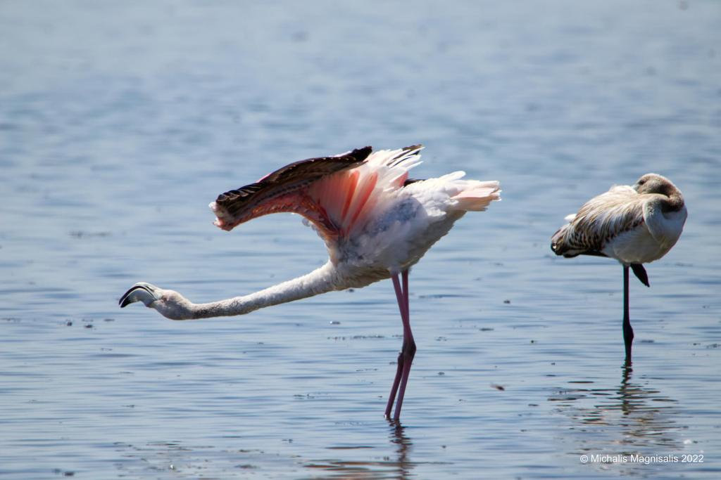 Τα φοινικόπτερα πιο γνωστά ως φλαμίνγκο, όταν γεννιούνται έχουν καφέ χρώμα και μετά το τρίτο έτος της ζωής τους γίνονται λευκά. Το χαρακτηριστικό ροζ χρώμα στα φτερά τους το αποκτούν σταδιακά όσο μεγαλώνουν επειδή τρώνε τις μικροσκοπικές γαρίδες Artemia, τις οποίες βρίσκουν στα ρηχά νερά των υγροτόπων. Τα πουλιά που βλέπουμε στην Ελλάδα συνήθως αναπαράγονται στην Τουρκία, στην Ιταλία, στη Γαλλία και στις χώρες της Βόρειας Αφρικής. Στην Ελλάδα αναπαράγονται πολύ σπάνια. Η πιο πρόσφατη αναπαραγωγή τους ήταν το 2020 στη λιμνοθάλασσα του Αγίου Μάμαντα στη Χαλκιδική. Παλιότερα έγινε το 2002 στην Αλυκή Καλλονής στη Μυτιλήνη.