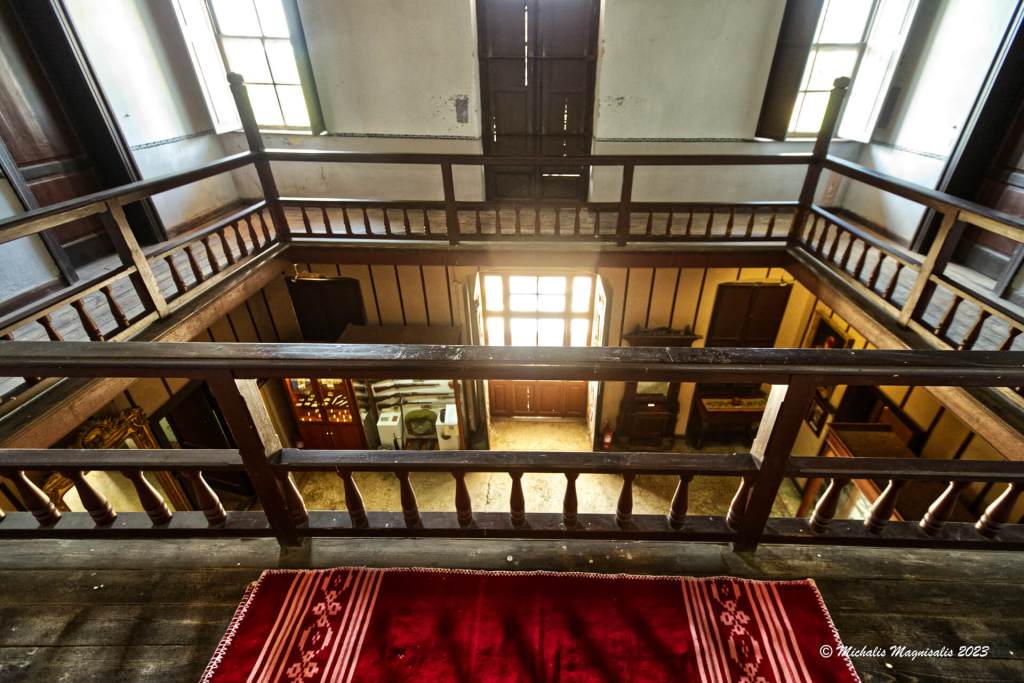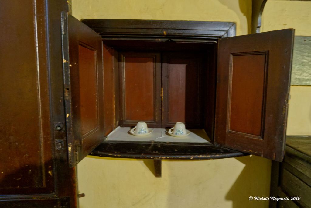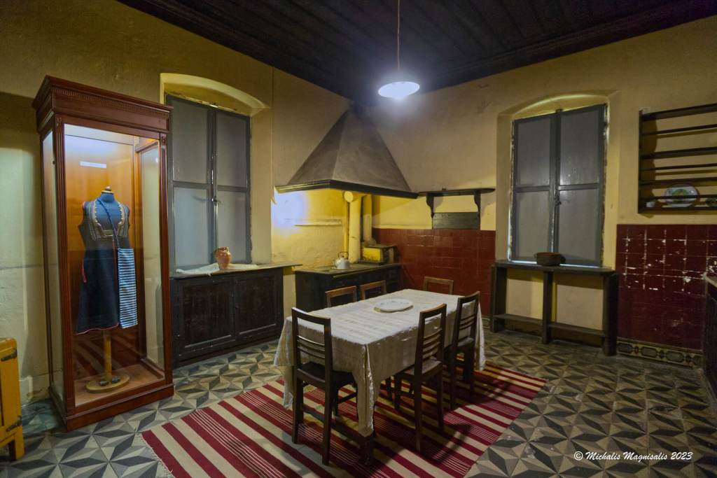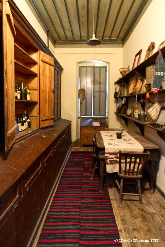 Προσεγγίζοντας την είσοδο, η προσοχή μας πέφτει πάνω στις εξαιρετικά βαριές σιδερένιες πόρτες, οι οποίες παρείχαν ασφάλεια από ληστές, μιας και το σπίτι ήταν σχετικά απομονωμένο από το χωριό.