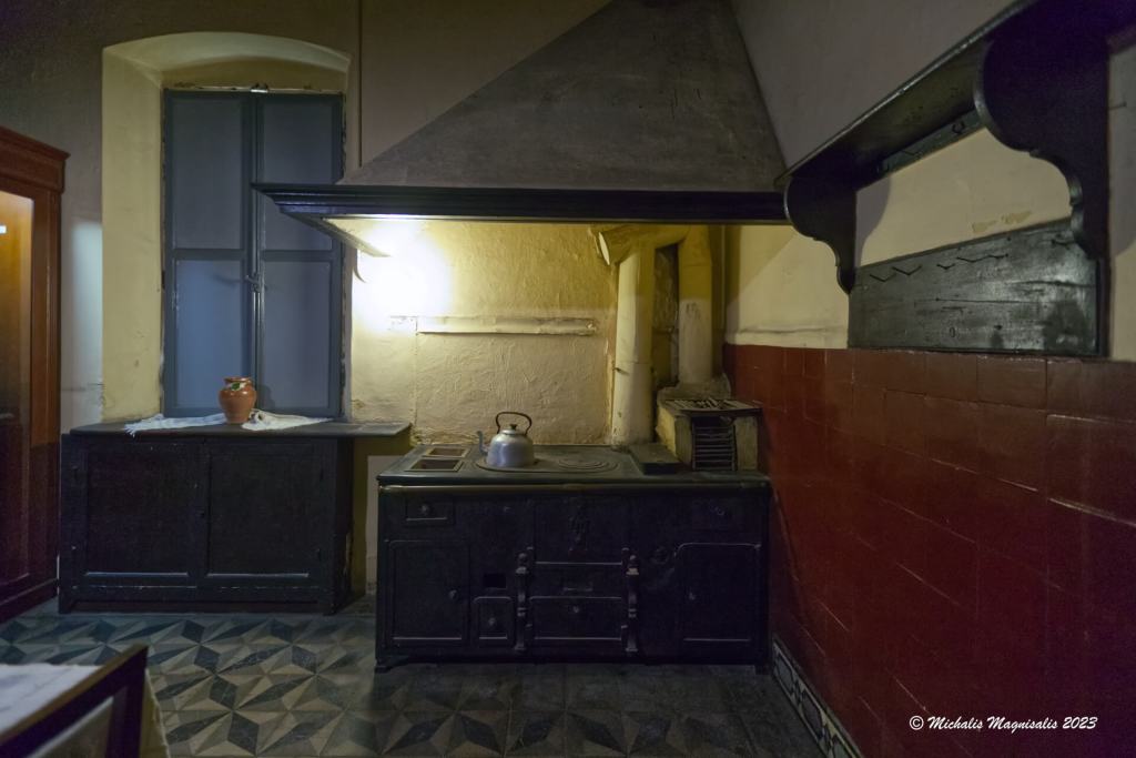 Πέρα από την κεντρική σάλα, στο ισόγειο υπάρχει η τραπεζαρία, ένα δωμάτιο υπηρεσίας, η κουζίνα και η τραπεζαρία του προσωπικού.
