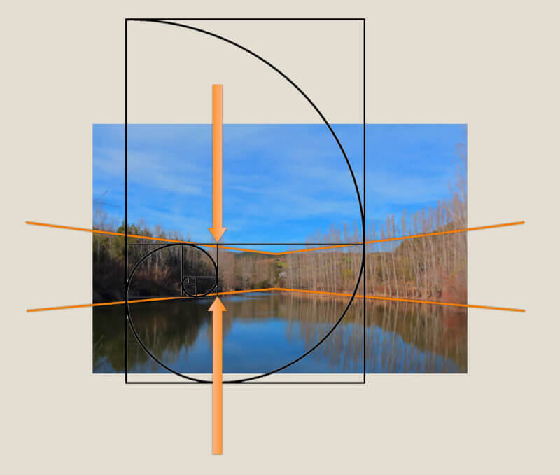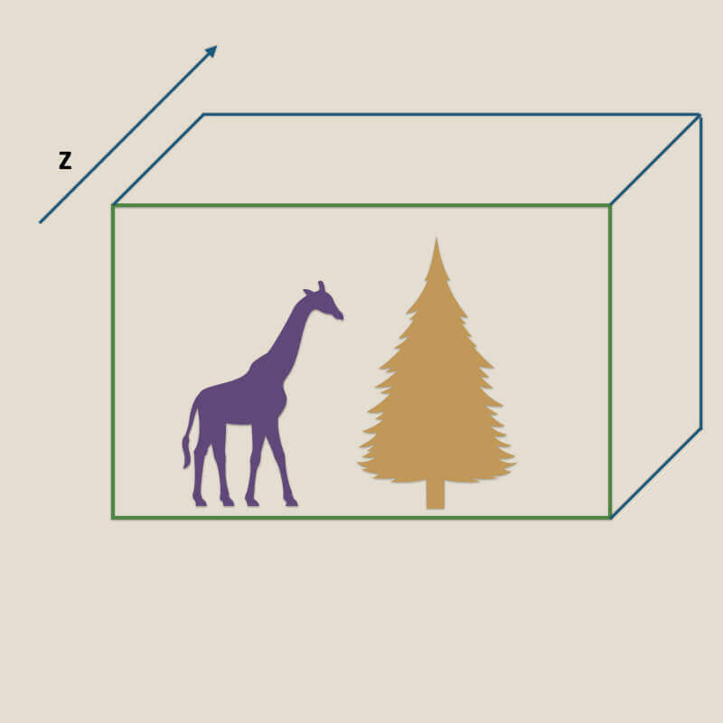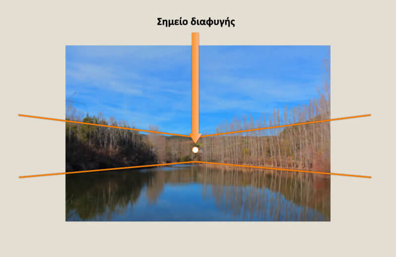 Στηνπαρακάτω εικόνα τα δέντρα είναι τοποθετημένα ανάμεσα σε δύο ζευγάρια νοητών ευθειών, οι οποίες συγκλίνουν προς ένα σημείο στο κέντρο της εικόνας. Αυτό ονομάζεται σημείο διαφυγής και θα μπορούσε να βρίσκεται κάπου στο άπειρο, δίνοντας έτσι την αίσθηση του τριασδιάστατου.