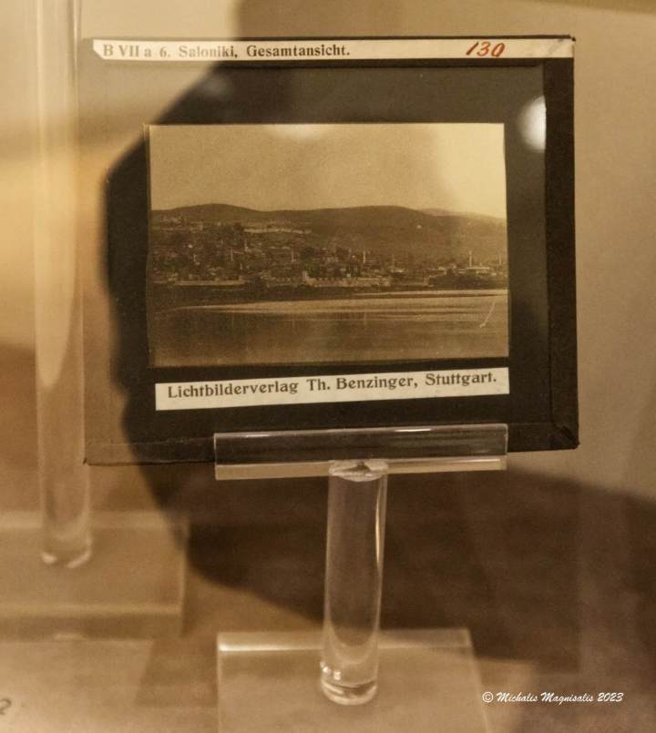 Στη φωτογραφία φαίνεται μια γενική άποψη της παραλίας της Θεσσαλονίκης (Saloniki Gesamtansicht), στην οποία διακρίνεται ο Λευκός Πύργος με το περιμετρικό οχυρωματικό τείχος, πριν αυτό γκρεμιστεί το 1911.