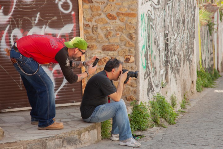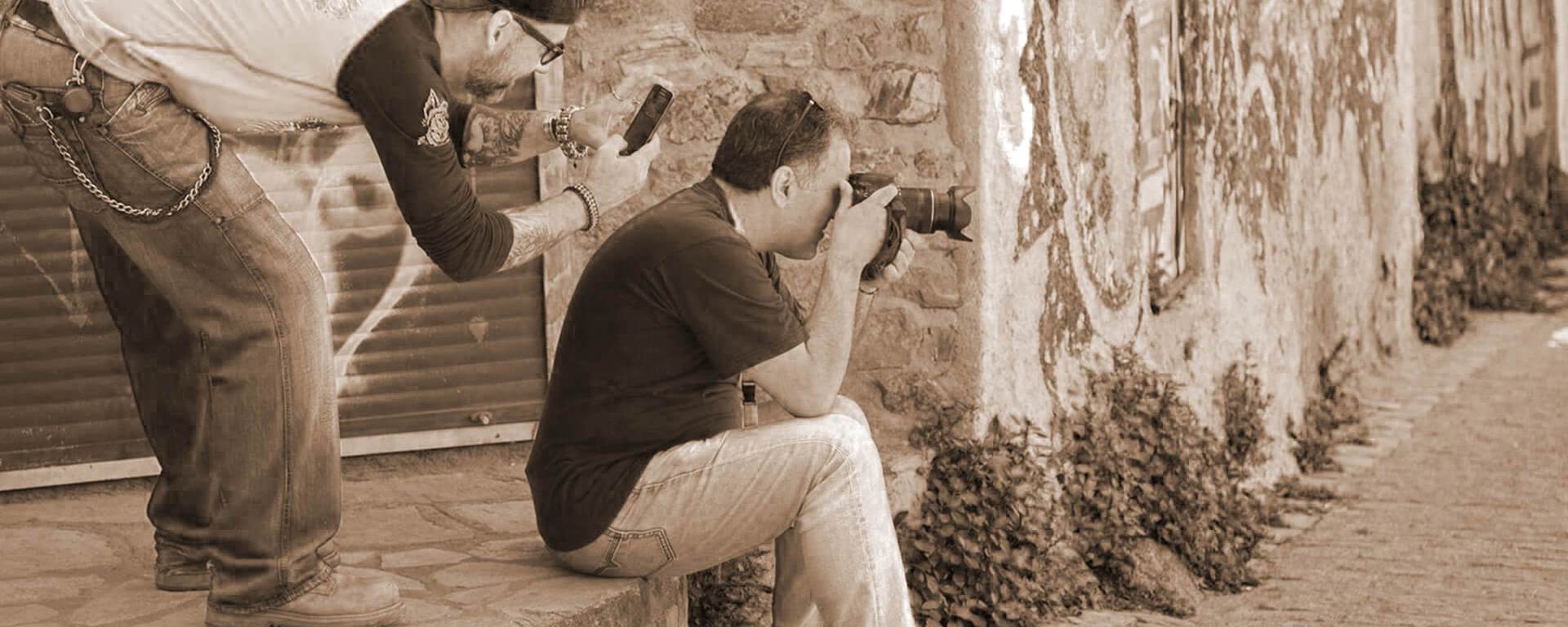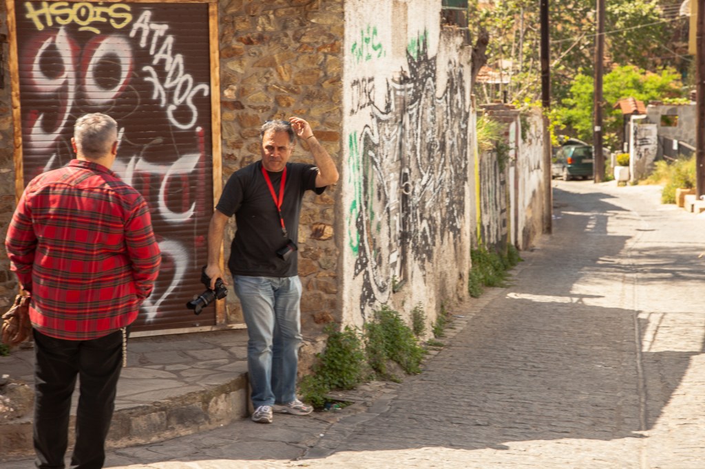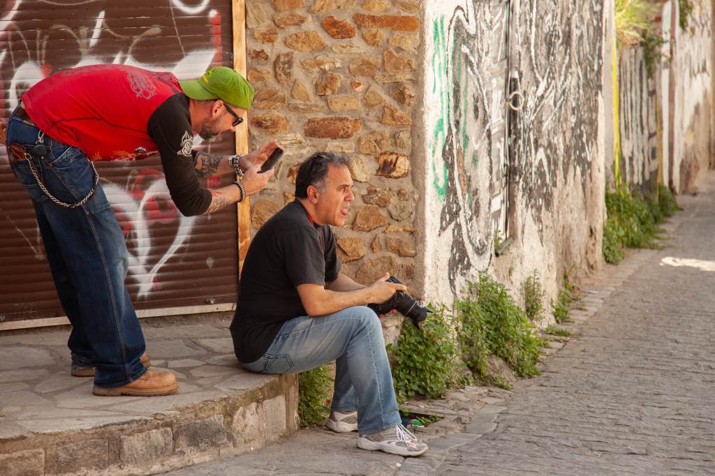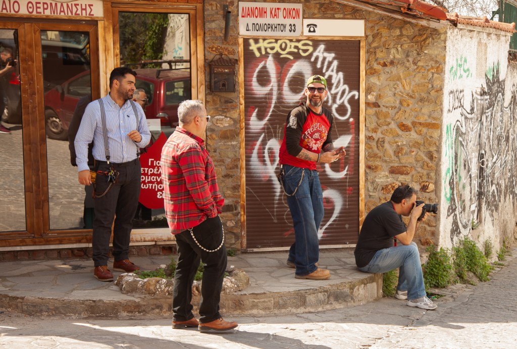 Απέναντί μου ακριβώς στον τοίχο ακουμπάνε δύο μηχανές Harley Davidson, που είχαμε αναλάβει να τις φωτογραφίσουμε για διαφημιστικούς σκοπούς. Ο λόγος που κάθησα δεν ήταν επειδή κουράστηκα, αλλά επειδή είχα βρει την ιδανική θέση για να έχω ένα κάδρο όπως ακριβώς το ήθελα. Τότε ήταν που ήρθε πίσω μου ο Ζώης, αυτός ο συμπαθής μηχανόβιος κύριος με την ξεχωριστή εμφάνιση και ιδιοκτήτης μίας από τις δύο Harley. Εντελώς διακριτικά τράβηξε με το κινητό του την ίδια φωτογραφία με εμένα. Μια χαρά τα κατάφερε. Τόσο καλά, σχεδόν όσο κι εγώ… Το σκηνικό συμπλήρωσε ο Βασίλης που βρισκόταν στην κατάλληλη θέση, την κατάλληλη στιγμή (καθρεφτίζεται επάνω αριστερά) και έκανε το μαγικό κλικ. «Για να έχουμε και λίγο backstage» είπε. Τους άλλους δύο να πω την αλήθεια, δεν θυμάμαι τα ονόματά τους.
