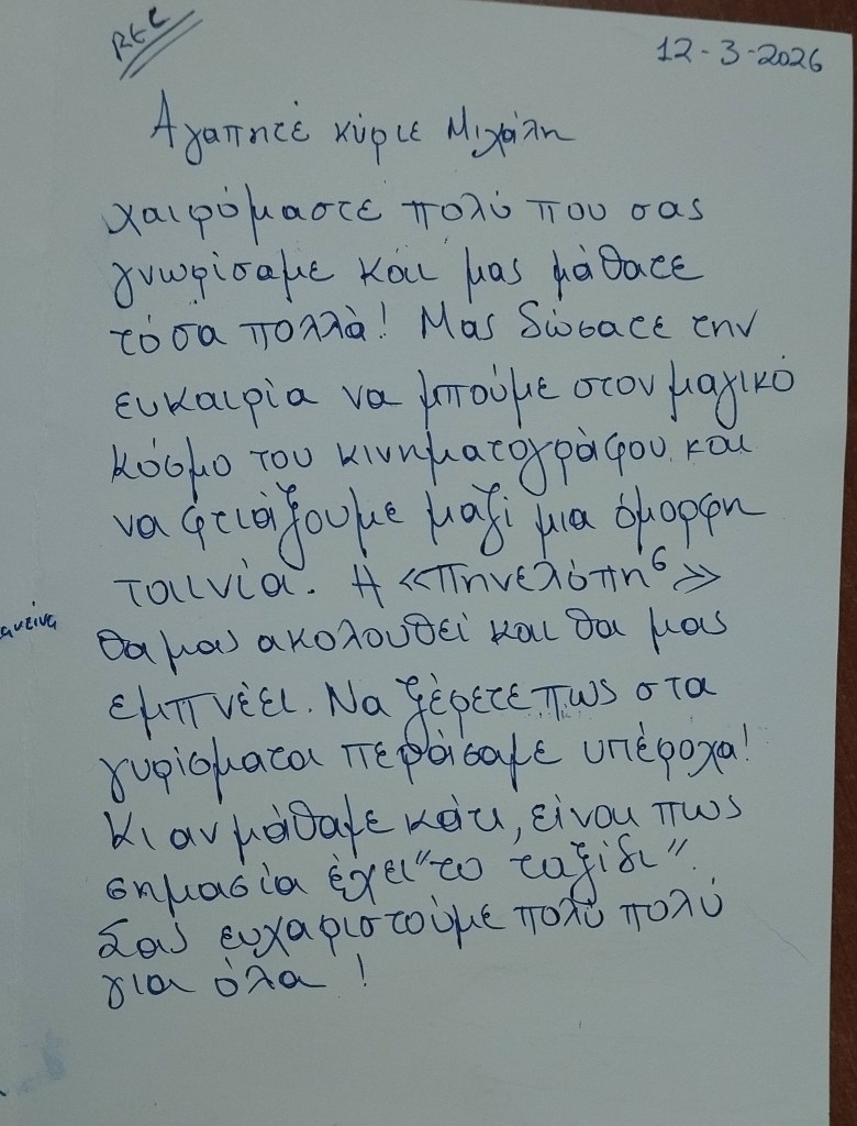Σήμερα όμως ήρθε το σχολείο σε μένα. Να ξέρετε, τίποτα δεν έχει τελειώσει. Η ταινία μας θα έχει ξεκινήσει το ταξίδι της μέσα στο χρόνο. Ένα ταξίδι που θα μας κρατάει αγκαλιασμένους για πάντα.