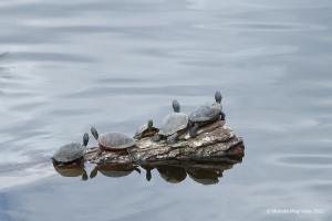 Με τον ερχομό της άνοιξης η θερμοκρασία σιγά σιγά ανεβαινει και οι κάτοικοι της λίμνης αρχίζουν να εγκαταλείπουν τη χειμωνιάτικη κρυψώνα τους. Οι χελώνες του νερού ανήκουν και αυτές στην κατηγορία των ερπετών όπως και οι χελώνες της στεριάς. Όπως όλα τα ερπετά, είναι ψυχρόαιμα ζώα και χρειάζονται τη ζέστη για να επιβιώσουν. Συνάντησα αυτή τη μικρή παρέα να λιάζεται επάνω σε έναν επιπλέοντα κορμό. Ακίνητες και …