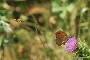 Εν τω μεταξύ στον μικρόκοσμο των εντόμων μια Maniola Jurdina έχει μόλις εγκατασταθεί στο άνθος του γαϊδουράγκαθου. Τρέφεται με φυτικούς ιστούς και νέκταρ και με τον τελετουργικό χορό της θα μεταφέρει τη γύρη, πιστή στο έργο της αναπαραγωγής του κύκλου της ζωής. Την ίδια στιγμή μια μέλλισσα πετάει προς τα εκεί με μεγάλη ταχύτητα έτοιμη να διεκδικήσει το μερίδιό της. Το σώμα της θυμίζει κάτι …