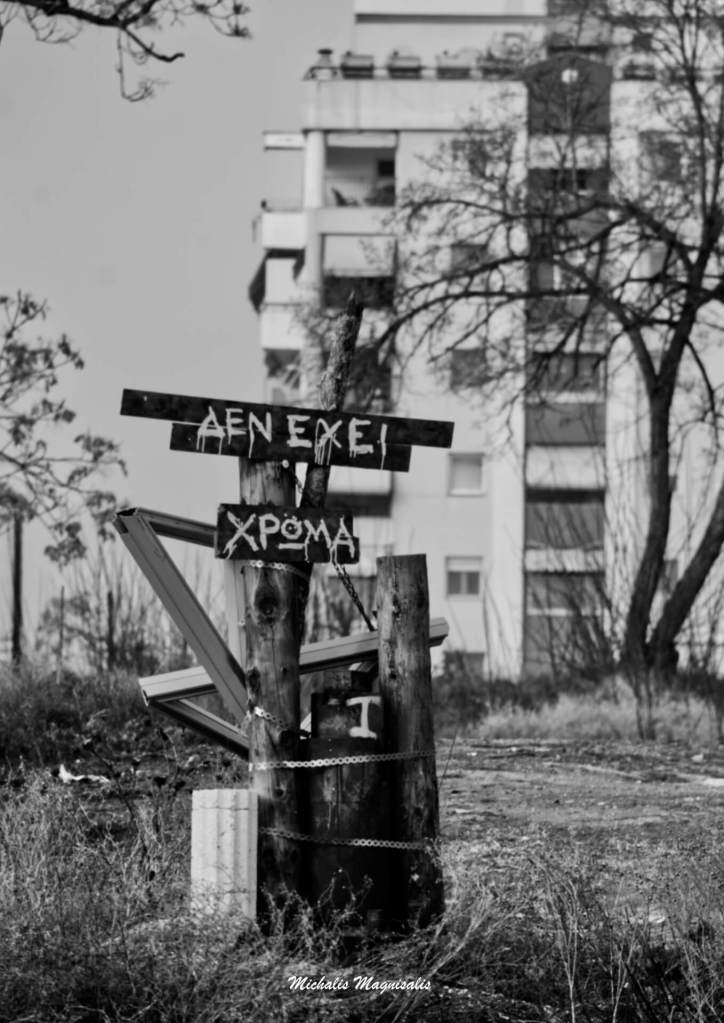 Για τρία χρόνια. Λαγκαδά και Δραγουμάνου γωνία. Μέχρι που το μήνυμα μπήκε μέσα μου: ναι…πουθενά δεν έχει χρώμα… Μια από εκείνες τις φορές που πήγαινα στη δουλειά, κατέβηκα στην κοντινότερη στάση, πλησίασα πεζός και το φωτογράφισα. Δεν έμαθα ποτέ ποιος το έκανε. Παλιότερα στην ίδια θέση υπήρχε ένα ισόγειο κτίριο από την εποχή του μεσοπολέμου, προφανώς βιοτεχνία ή κατάστημα. Είχε παραδοθεί κι αυτό στη λήθη, μέχρι που άρχισε να γίνεται επικίνδυνο για τους περαστικούς και στο τέλος το κατεδάφισαν.